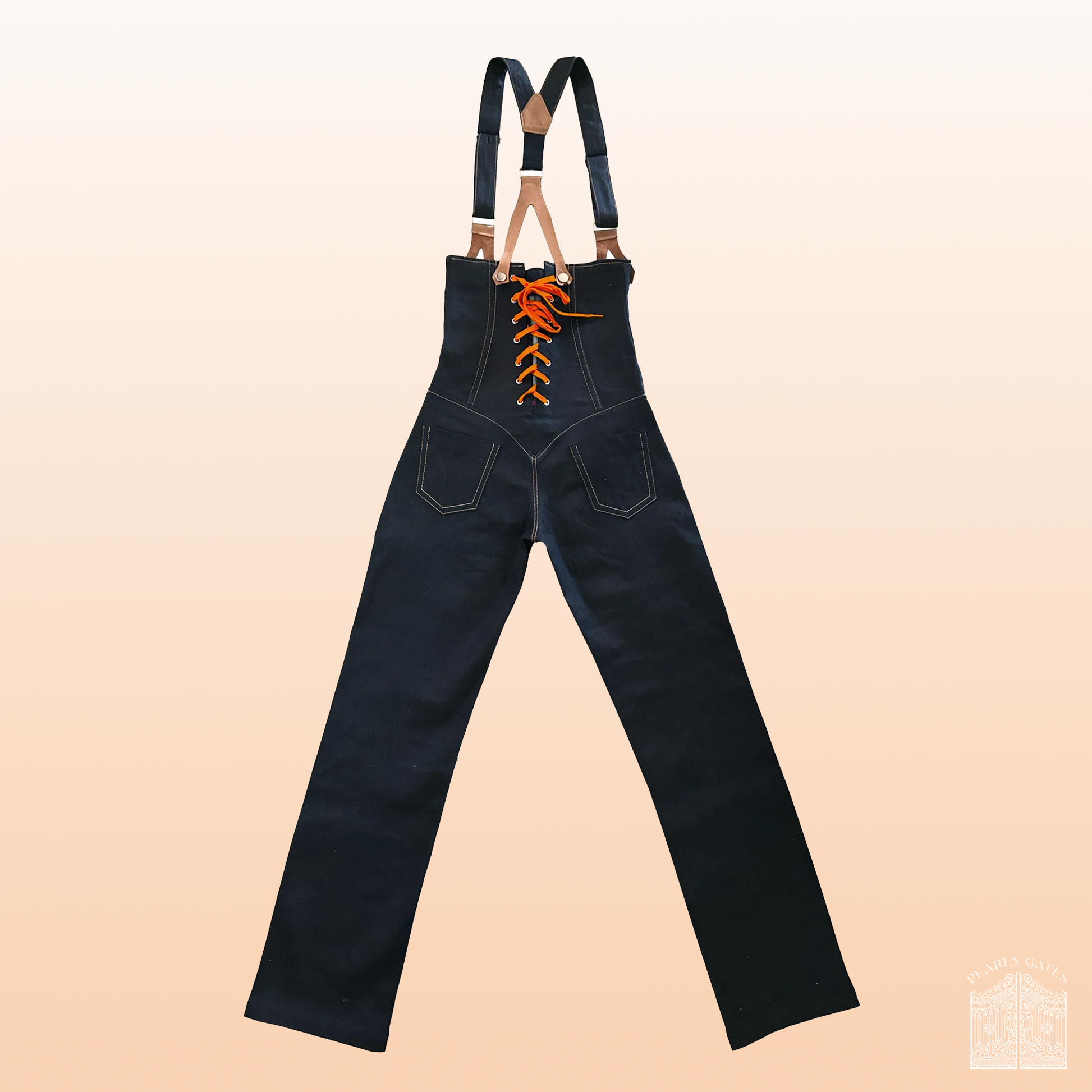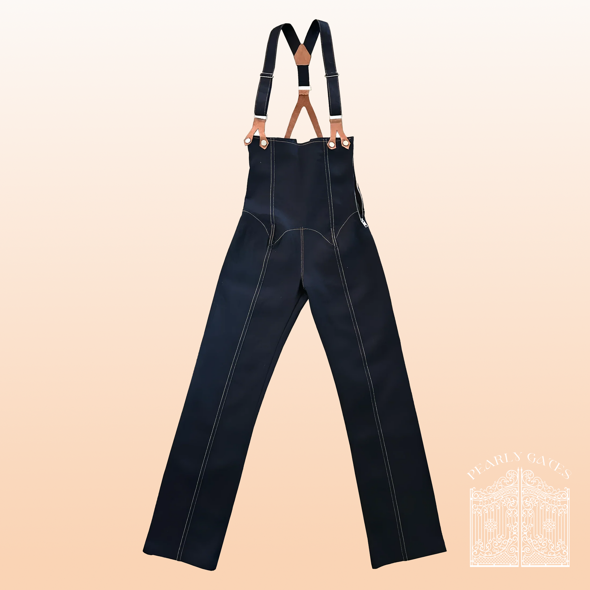Premium Dark denim, high waisted overalls, detachable suspenders , side zip, and a lot of stretch, the more you wear them the better they fit.